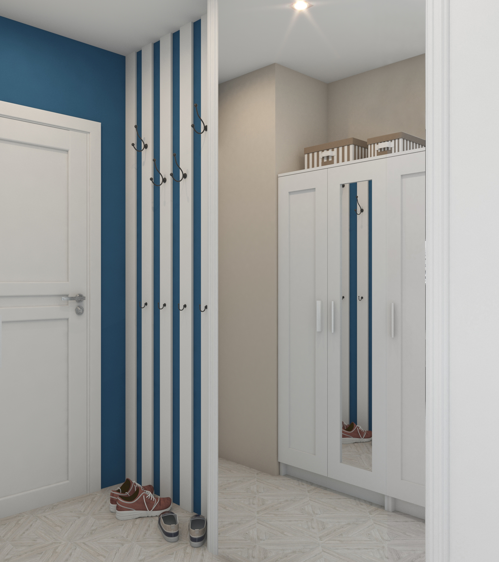 Эффектная, и при этом весьма бюджетная находка: вертикальные рейки с крючками на акцентной стене прихожей. Выполнены из кухонного цоколя, поэтому практически не утяжелили скромный бюджет проекта.