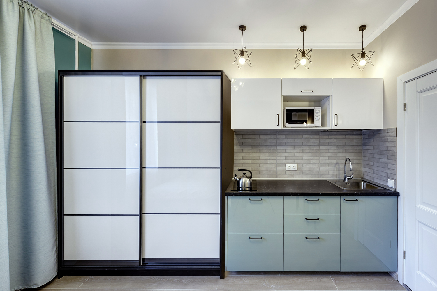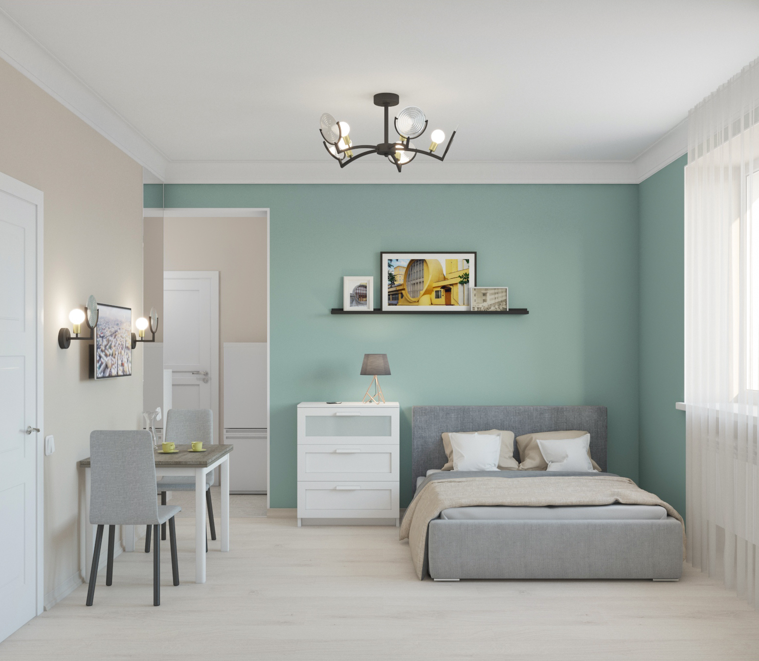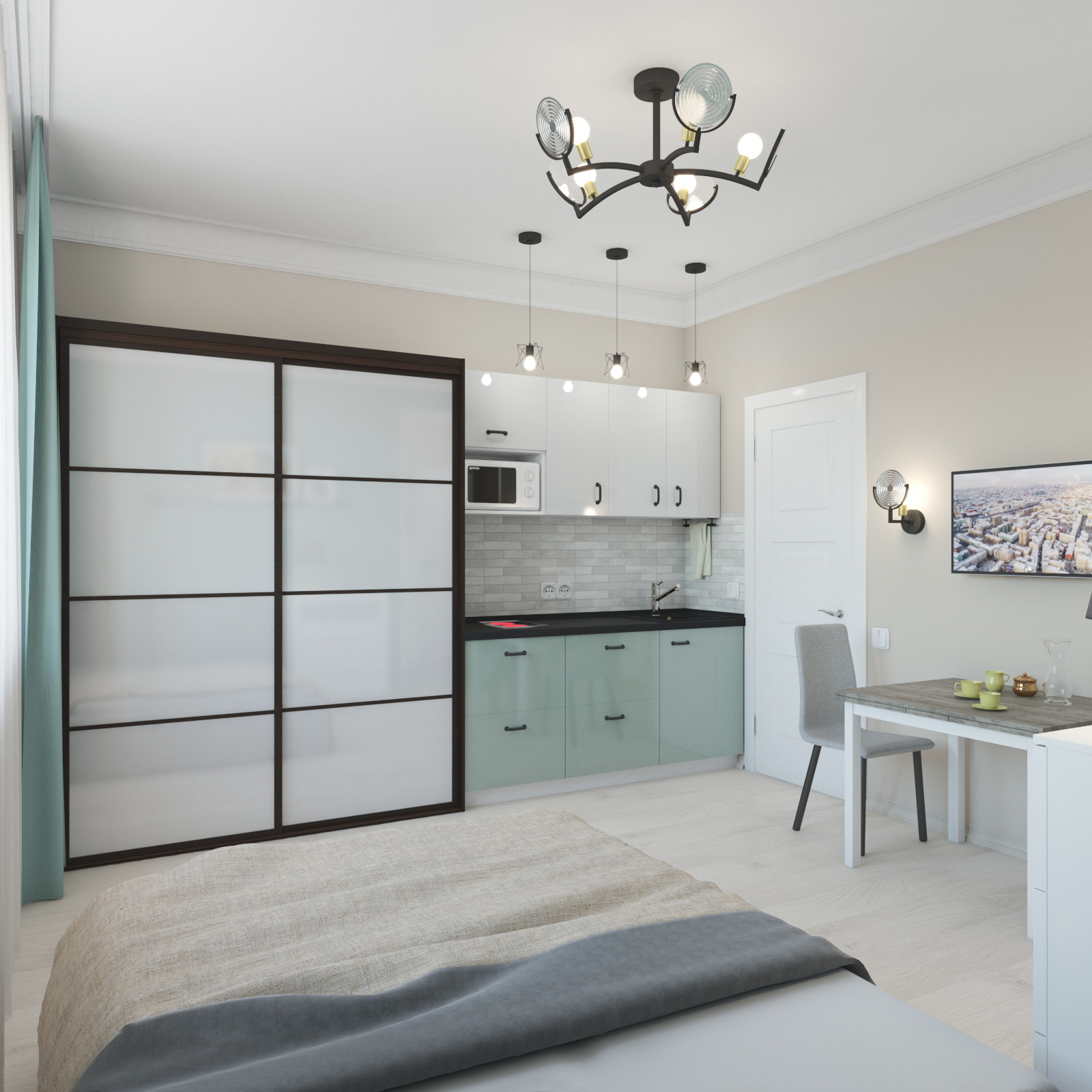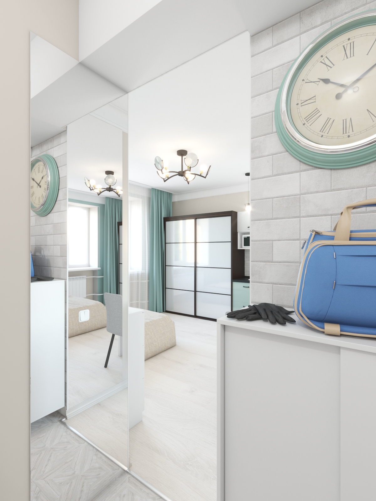 Студия номер 2 демонстрирует более демократичный подход с оформлению интерьера. Для того, чтобы придать ей изюминки, мы решили использовать ростовые настенные зеркала и актуальный акцентный цвет хвойного оттенка.