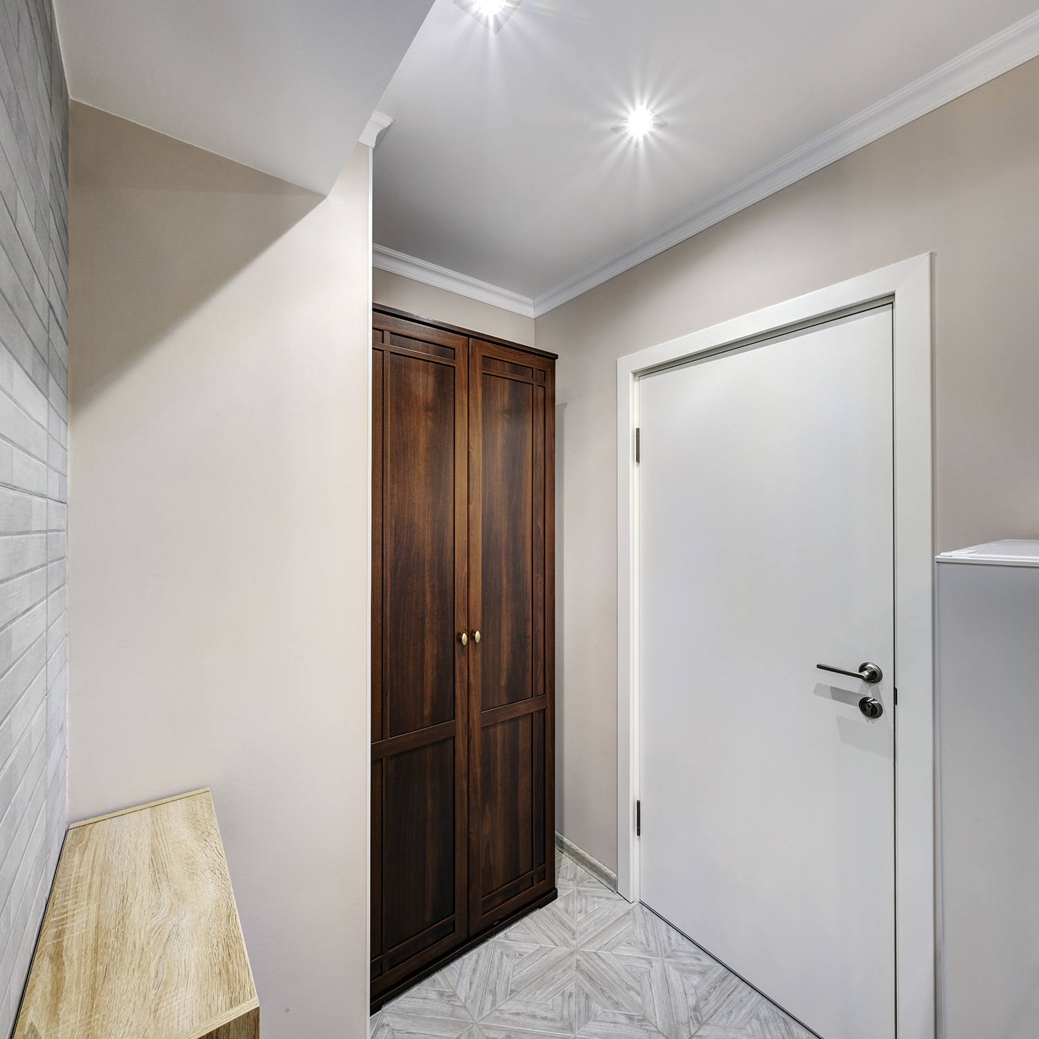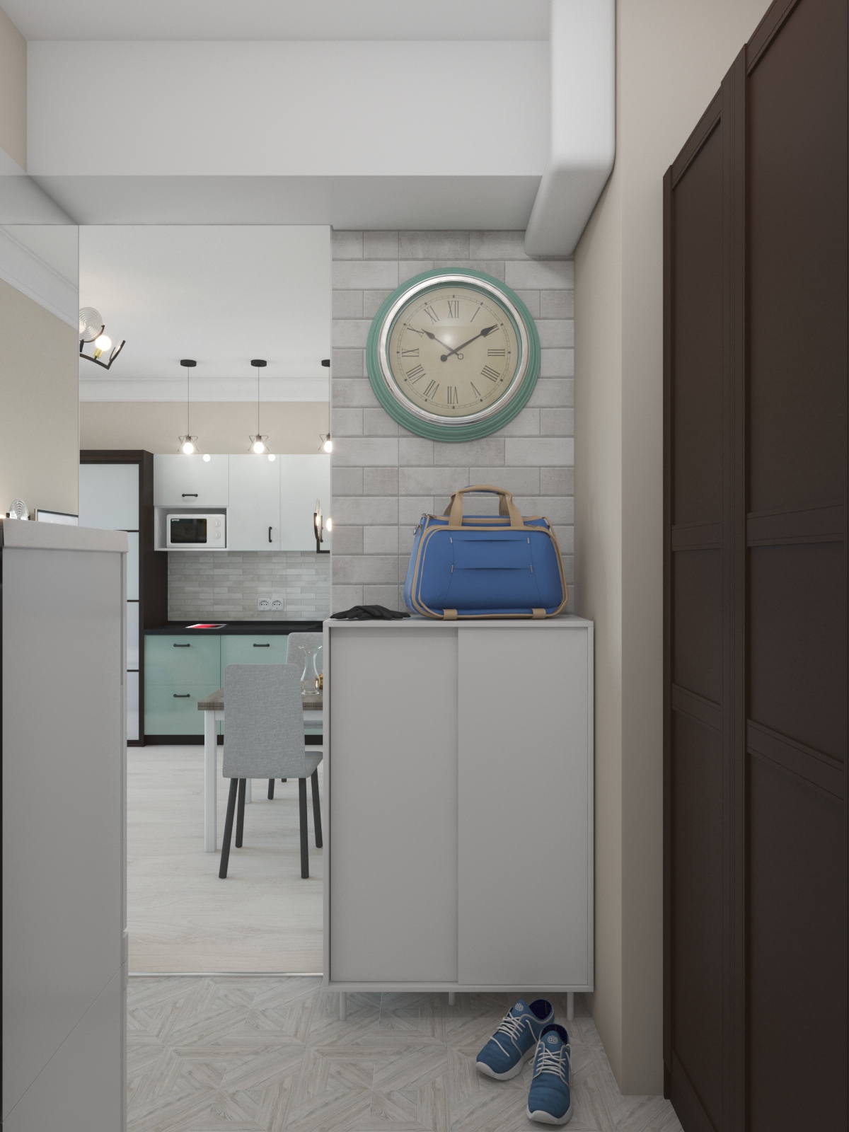 Плитка в прихожей повторяет рисунок на полу общего коридора, но в более нейтральном светло-сером тоне. Того же цвета и плитка "под кирпич" на кухонном фартуке и стене прихожей.