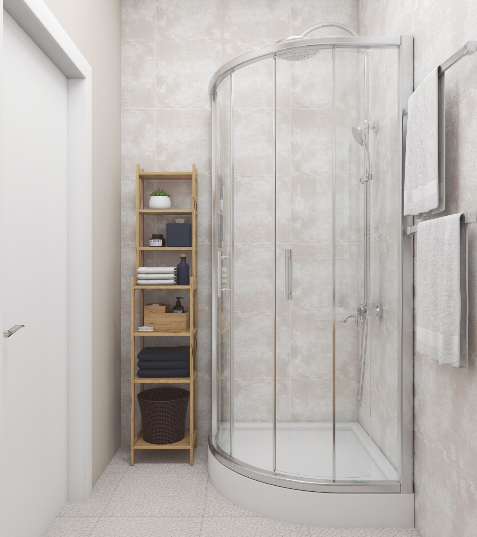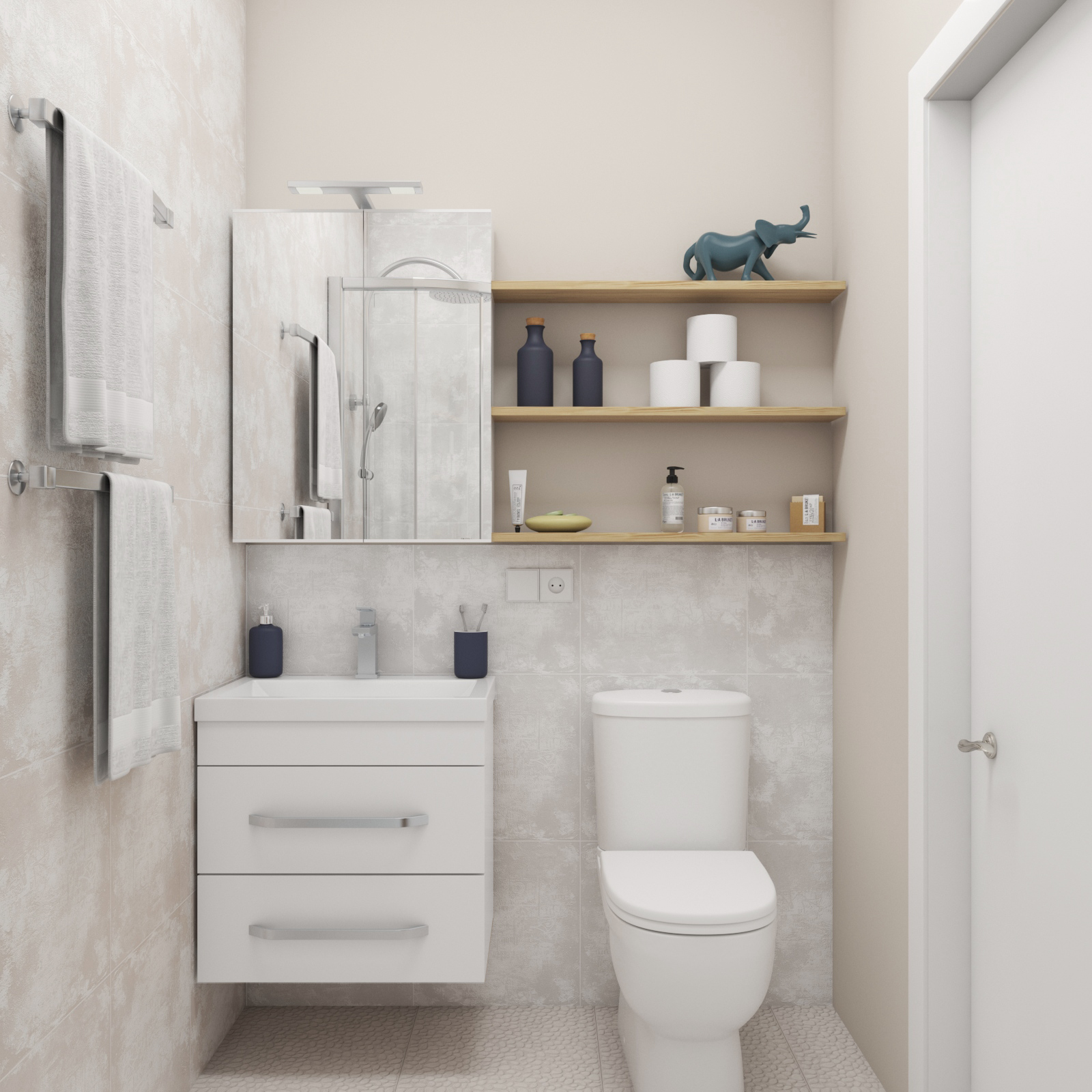 Санузел оформлен в спокойных натуральных тонах
