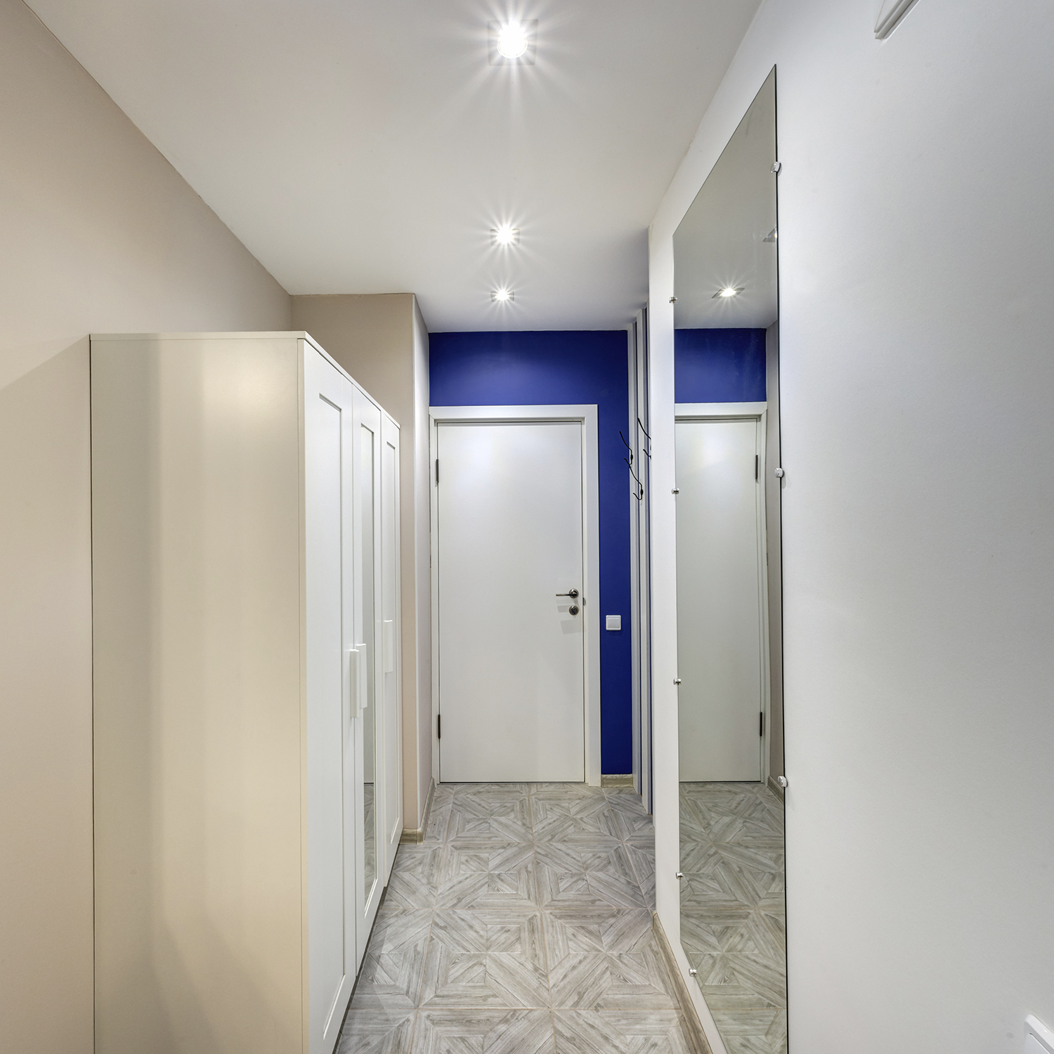 Напротив шкафа для верхней одежды в прихожей размещено большое зеркало во всю высоту стены. Помимо выполнения своих прямых функций, оно зрительно расширяет пространство, избавляя от ощущения тесноты.