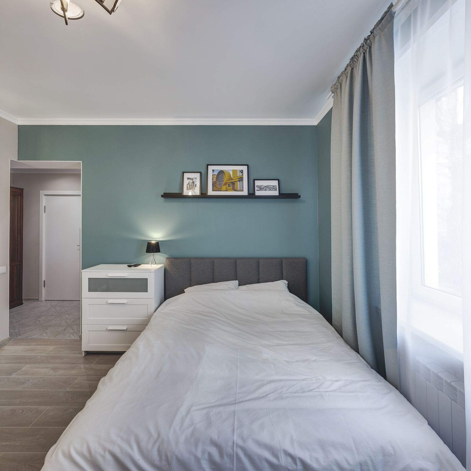 Пол выстелили ламинатом, имитирующим узкую половую доску. Для того, чтобы избежать впечатления фальши, на плинтусе решили не экономить и взять шпонированное изделие. Благо его потребовалось не много.