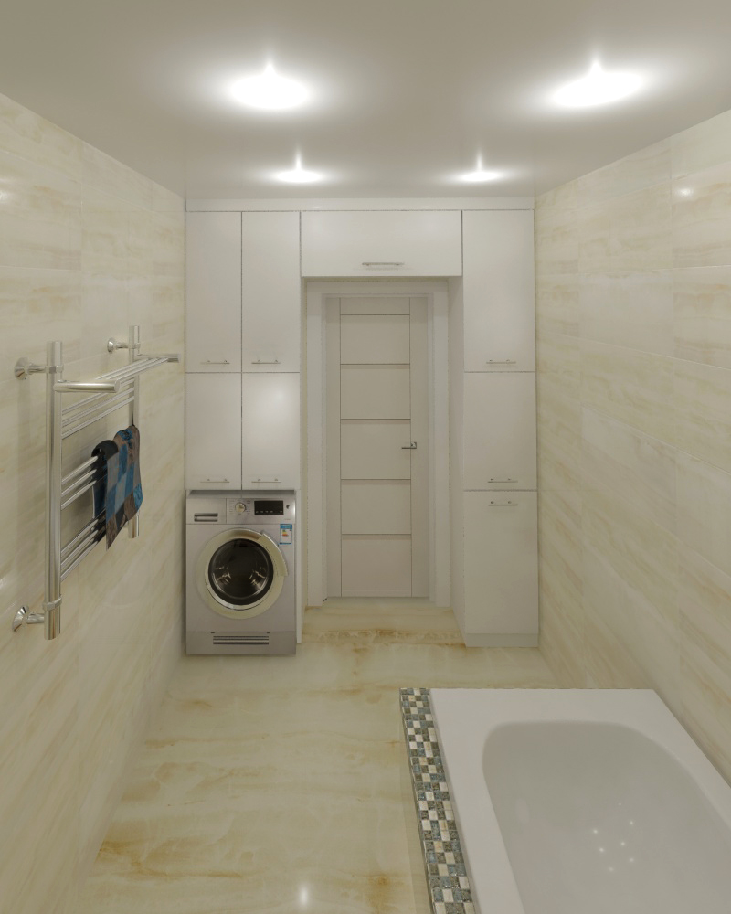 Места для отдельной постирочной в квартире не нашлось, поэтому для размещения стиральной машины и всего подсобного хозяйства пришлось соорудить целый портал вокруг двери. За верхними дверцами слева прячется водонагреватель на 50 литров.