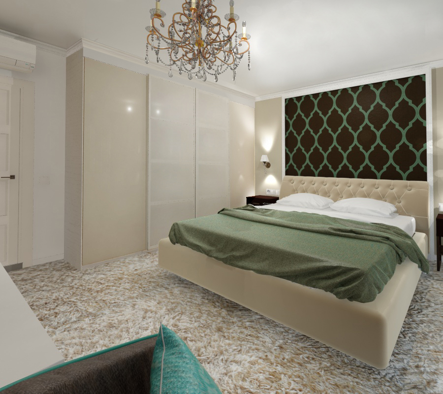 Спальню оформили в спокойных бежевых и коричневых тонах, а в качестве акцента использовали бирюзовые оттенки.