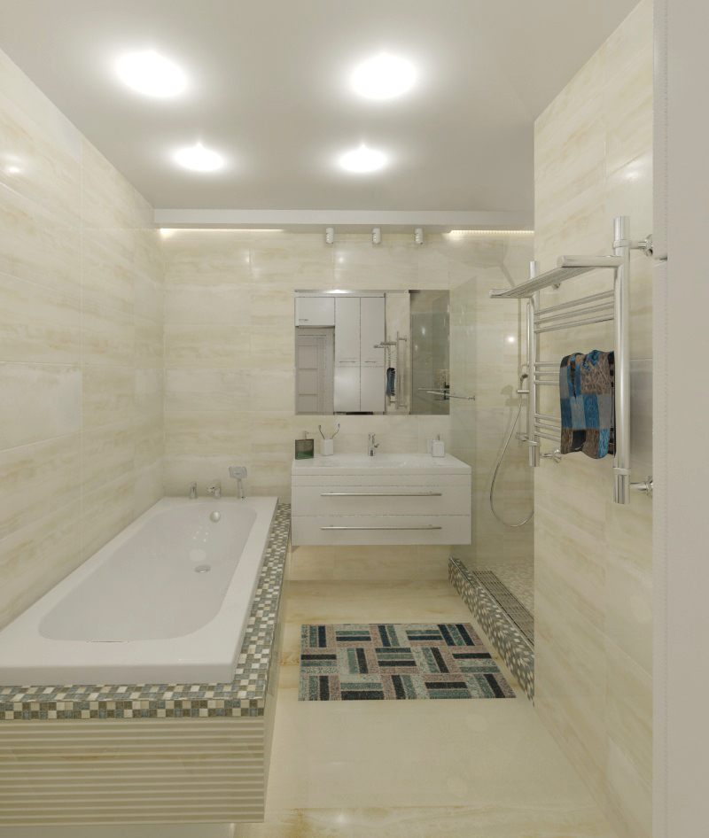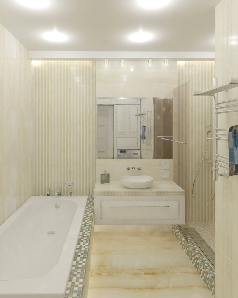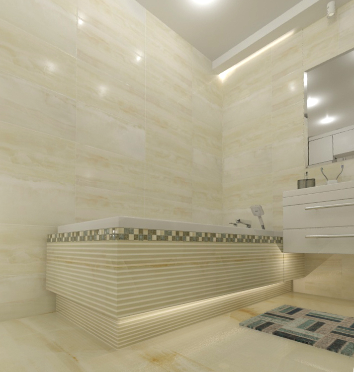 Стены помещения выложены плиткой, имитирующей оникс, а бортики ванной и пол душевой - стеклянной мозаикой с каменными вставками в тон.
