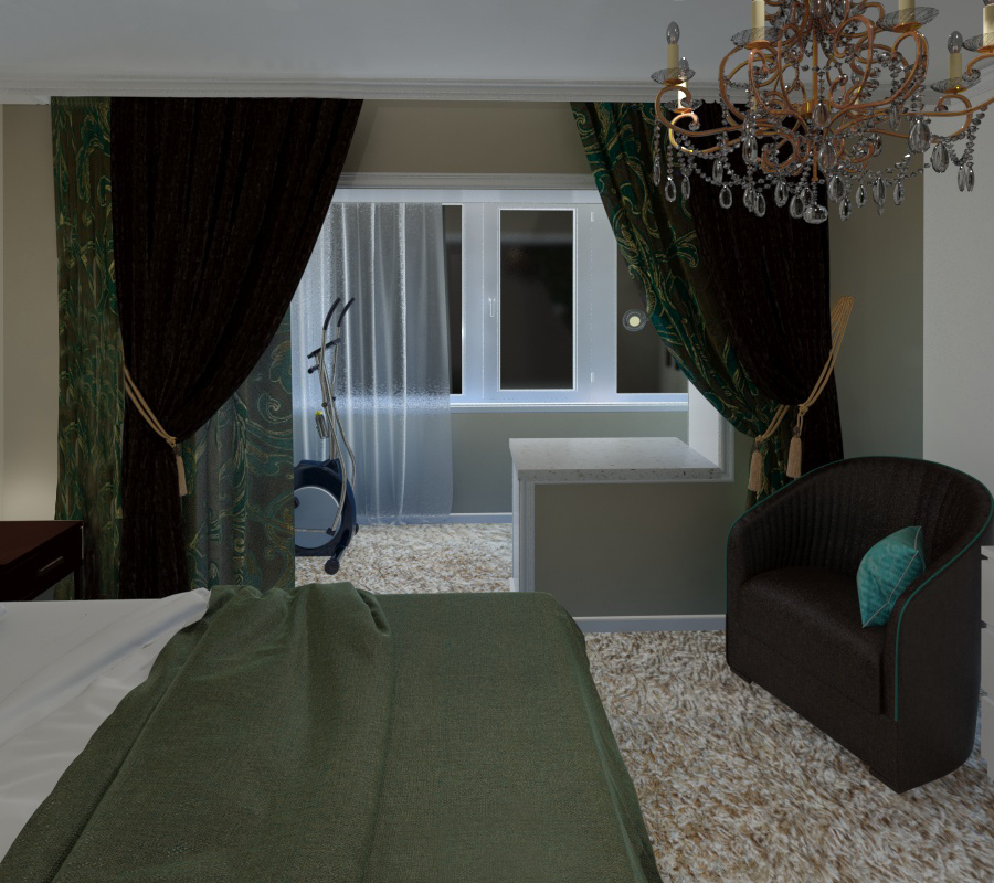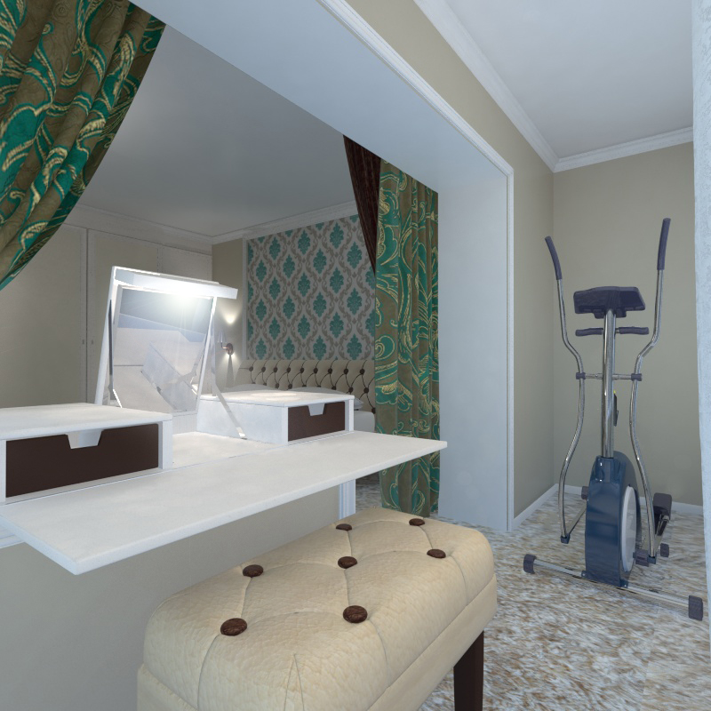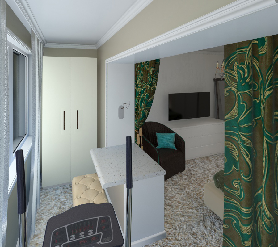 Присоединенная лоджия пригодилась в качестве спортзала для хозяина и зоны с туалетным столиком для хозяйки.
