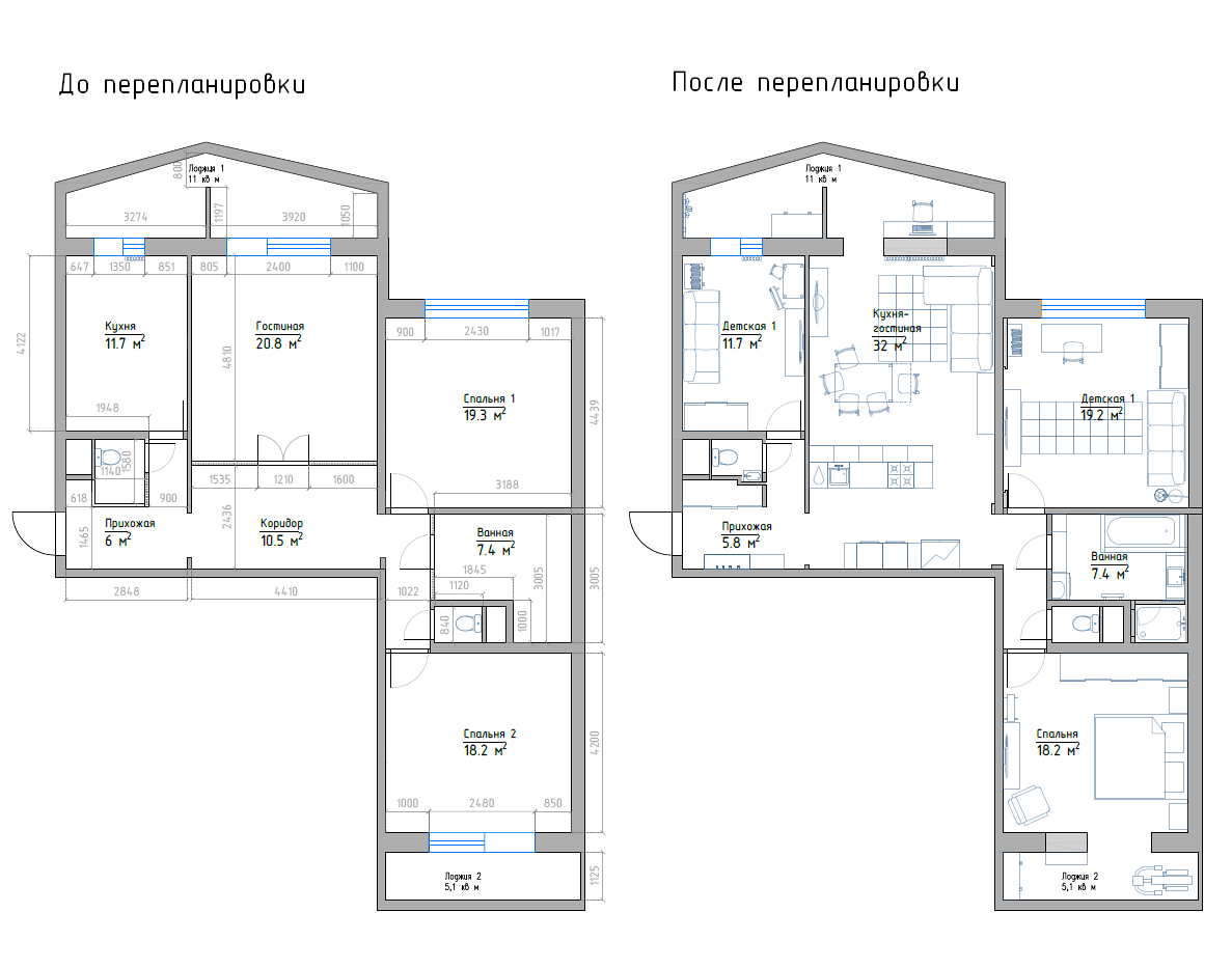 Площадь квартиры до перепланировки 112,8 квадратных метров (вместе с лоджиями).