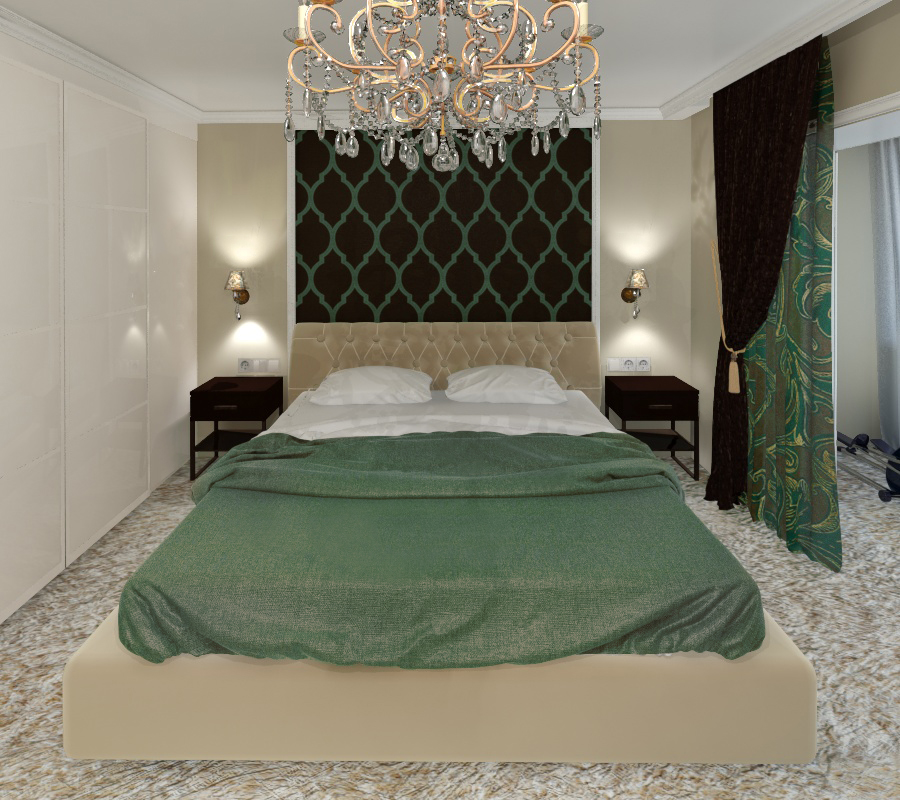 Бирюзовый испольуется и на обоях с орнаментом в стиле ар-деко над изголовьем кровати.