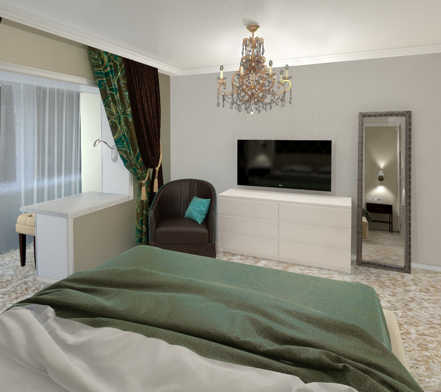 Хрустальная люстра на потолке переехала за владельцами из предыдущей квартиры. Поэтому в спальне общая современная стилистика оформления жилья немного мигрировала в сторону классики.