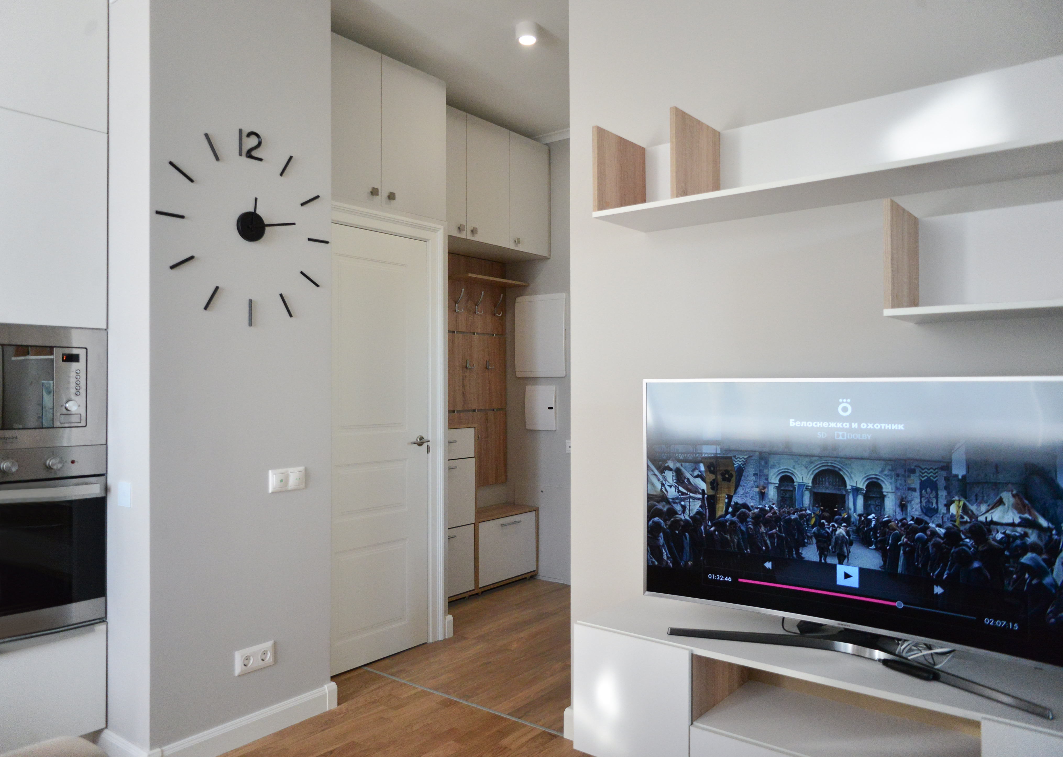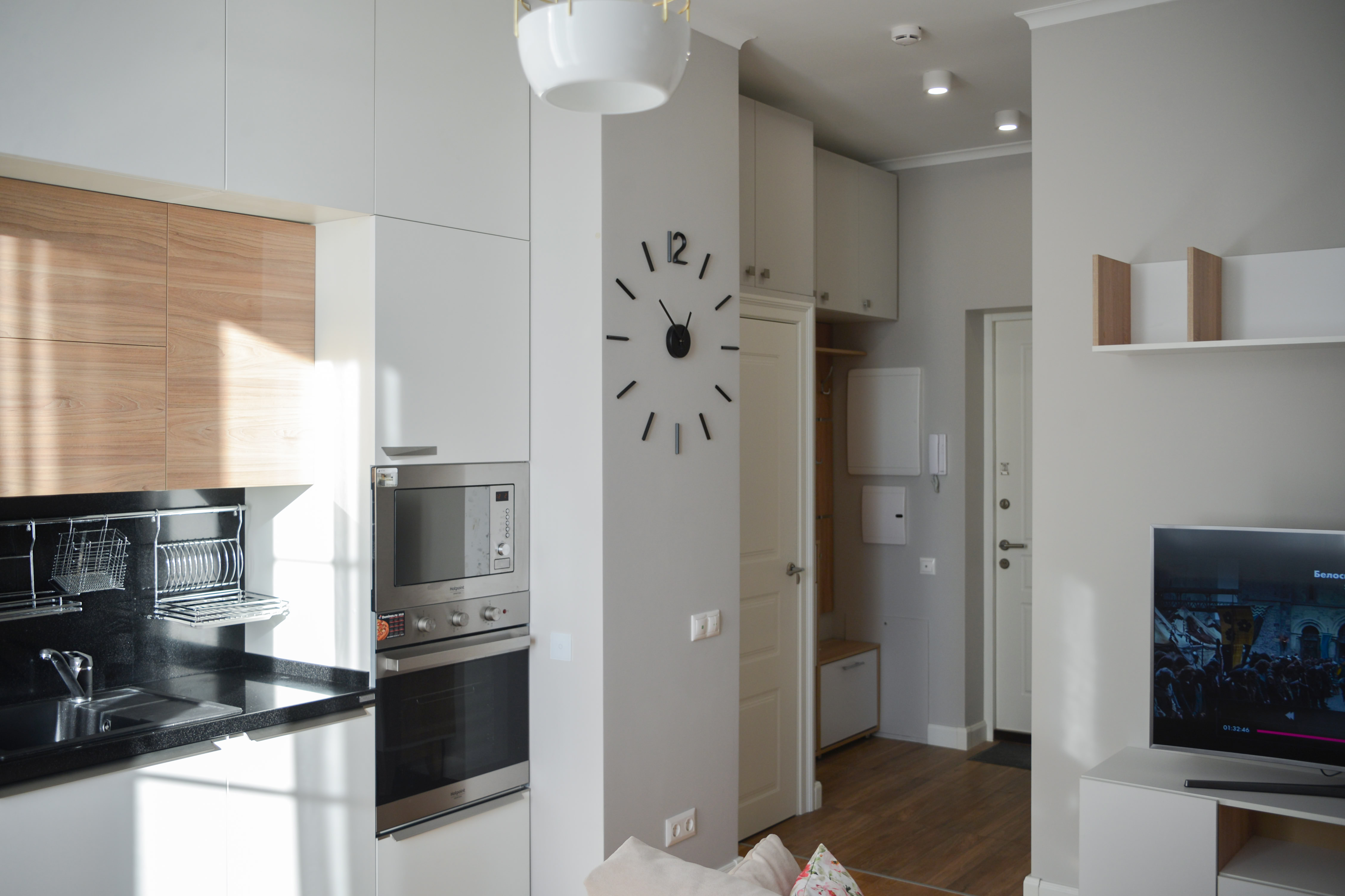 Минималистичные часы, украшающие стену между прихожей и кухней-гостиной, тоже имеют свою историю. Сначала Ирина подобрала для этого простенка часы за 15 тысяч рублей. Но потом нашла вполне достойный аналог в несколько раз дешевле. Именно он в итоге и стал акцентной деталью интерьера.