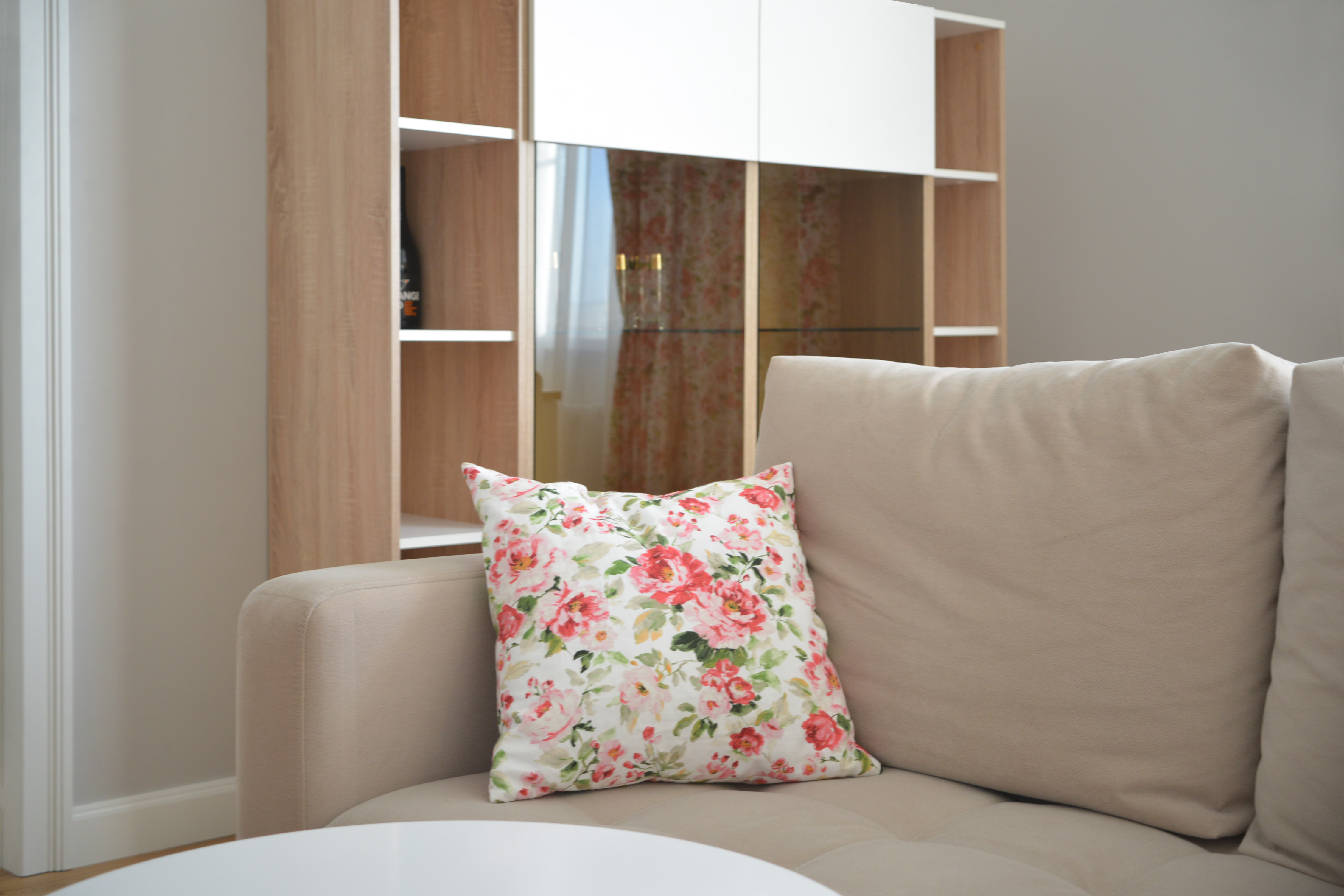 Поэтому классический минимализм нуждам владелицы не отвечал: слишком отстаненный, лишенный “души”. Именно затем, чтобы вдохнуть в интерьер жизнь, Ирина подобрала текстиль с активным цветочным принтом для штор и подушек.