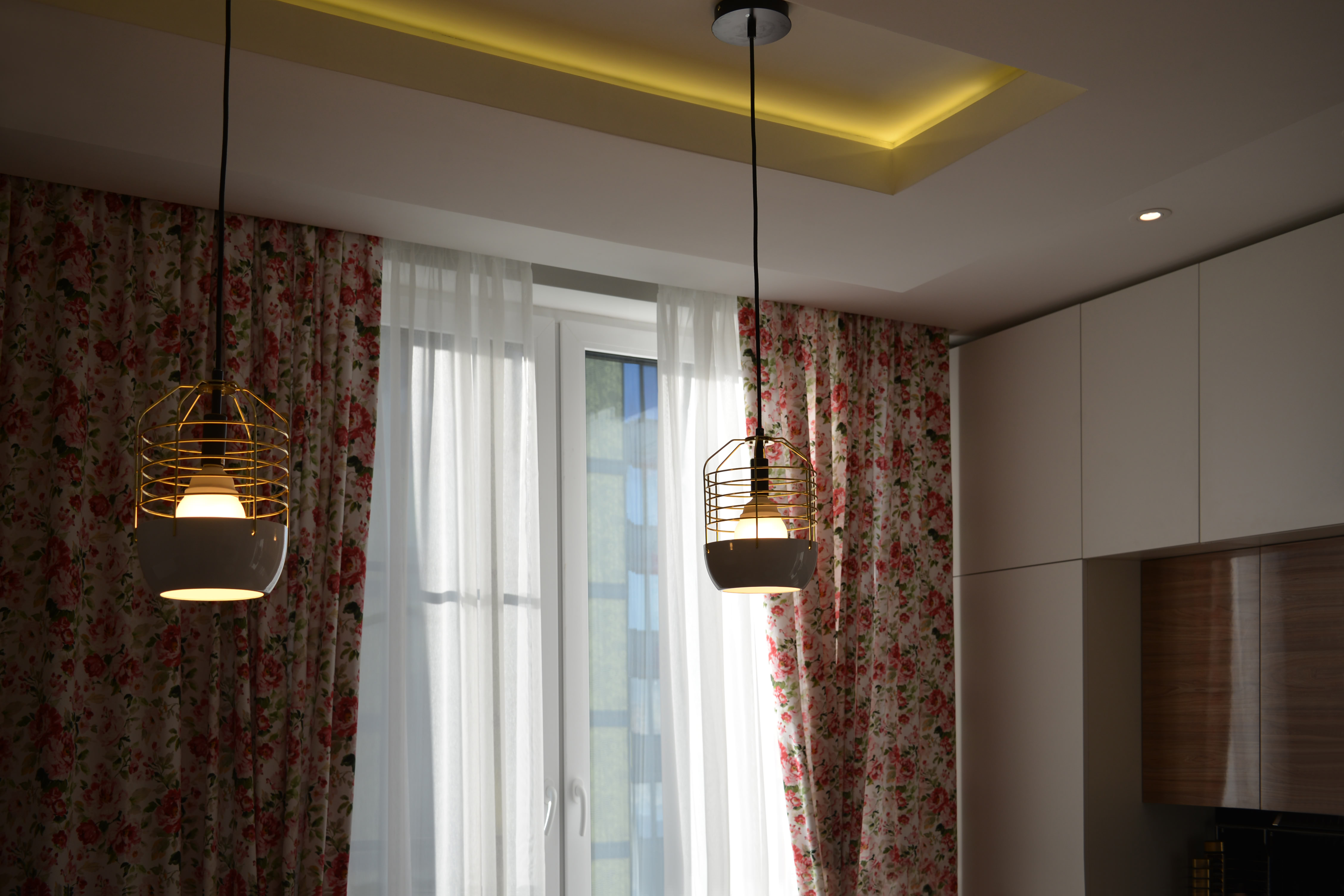 Вместо того, чтобы опустить часть потолка по периметру, мы сделали выступ по центру, где он не мешает окнам и дверцам шкафов. Избавиться от ощущения громоздкого выступа позволило еще одно отверстие в его центре. Туда отлично встали светильники-подвесы.