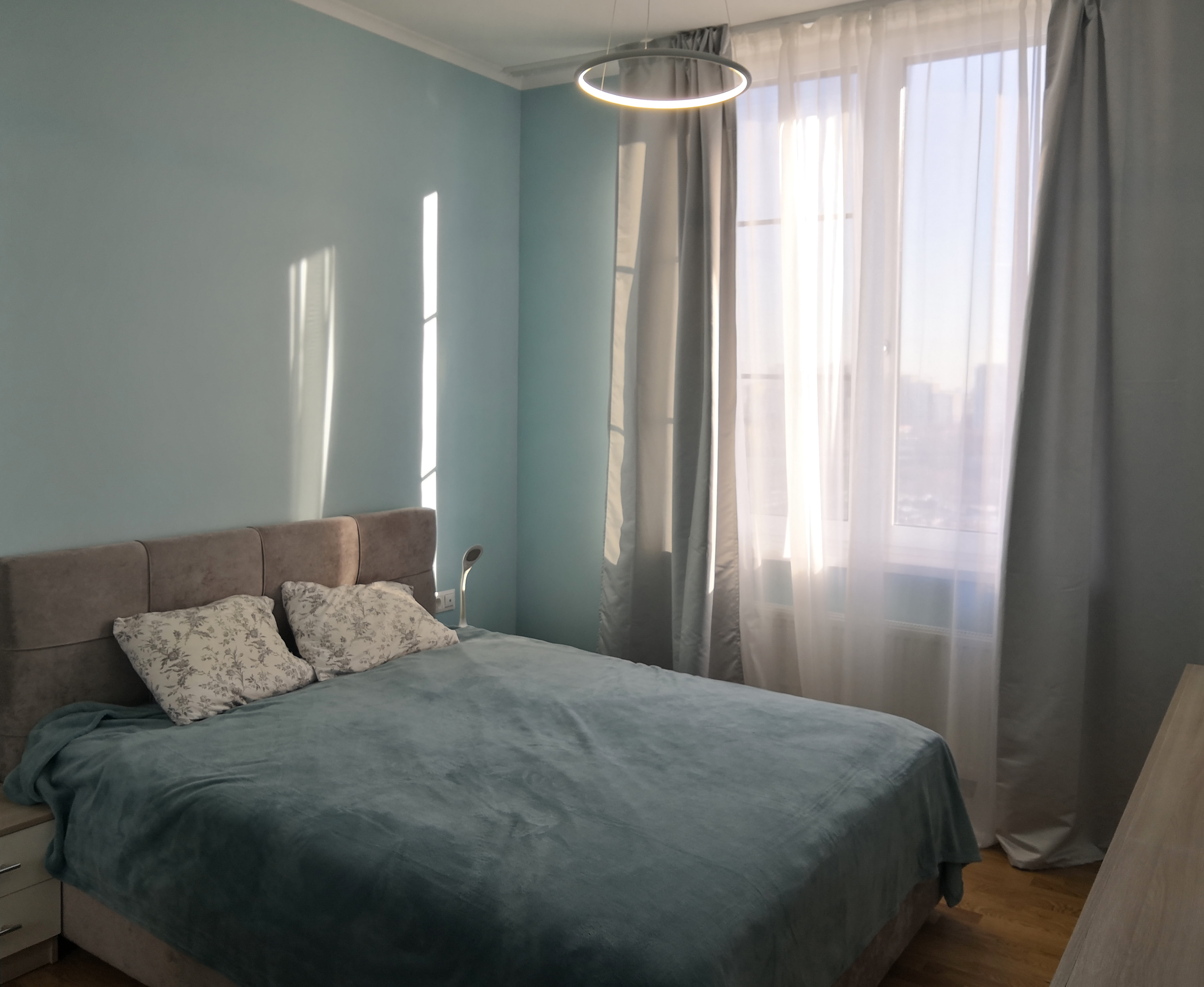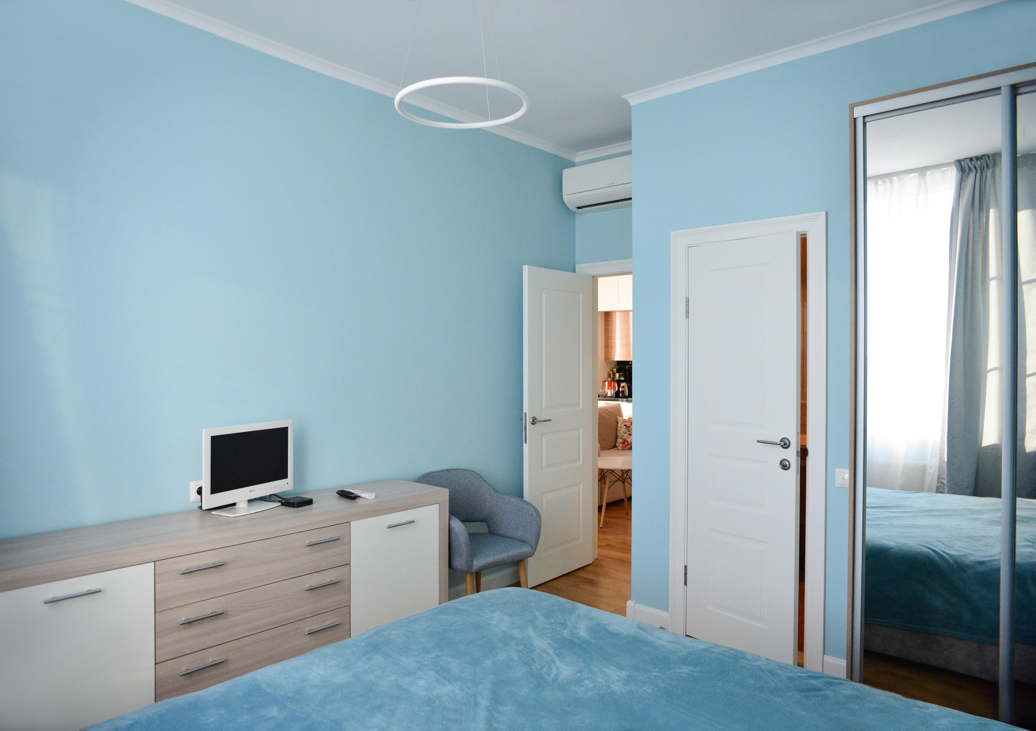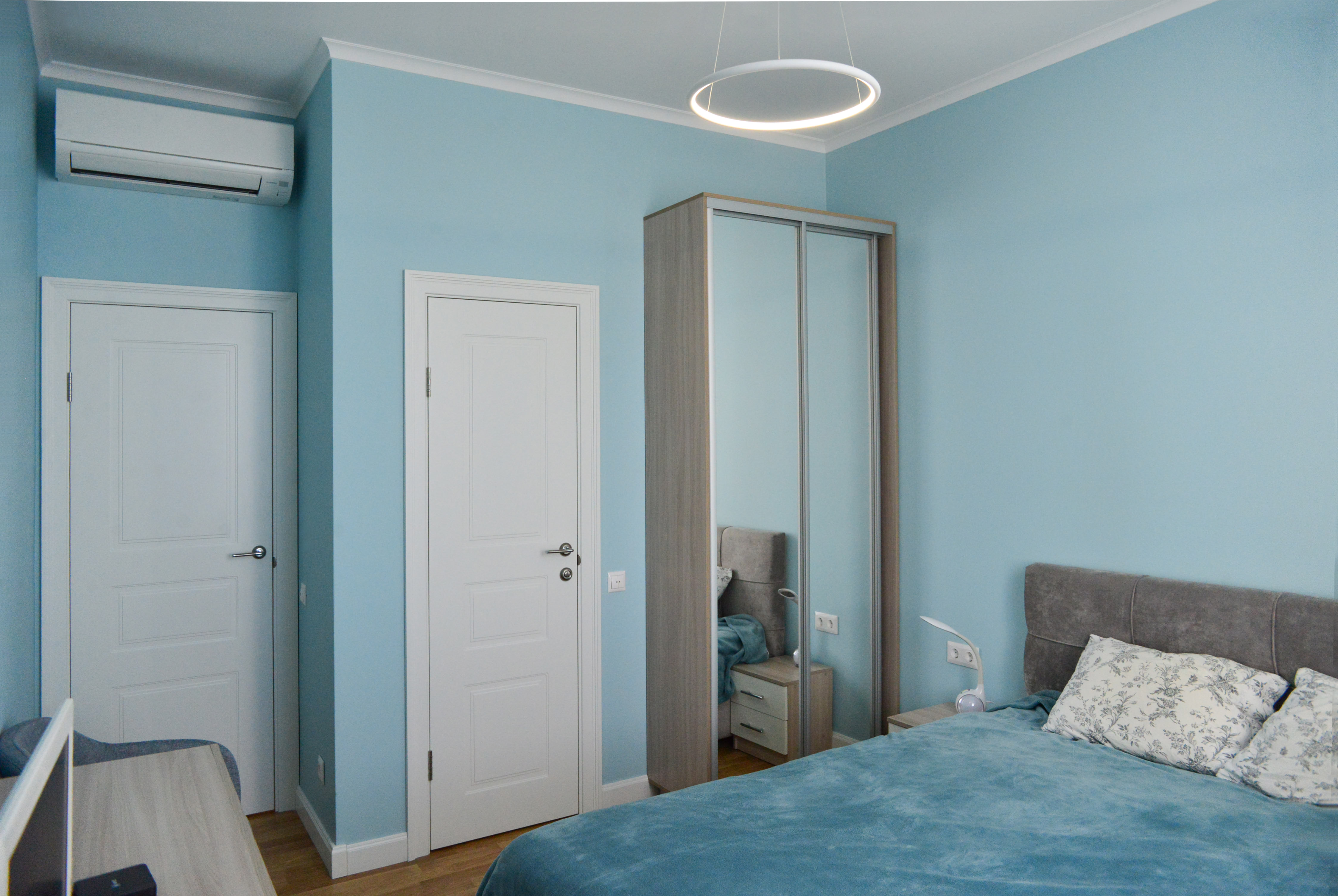 Хозяйская спальня выдержана в прохладной небесно-голубой гамме с бирюзовым отливом.