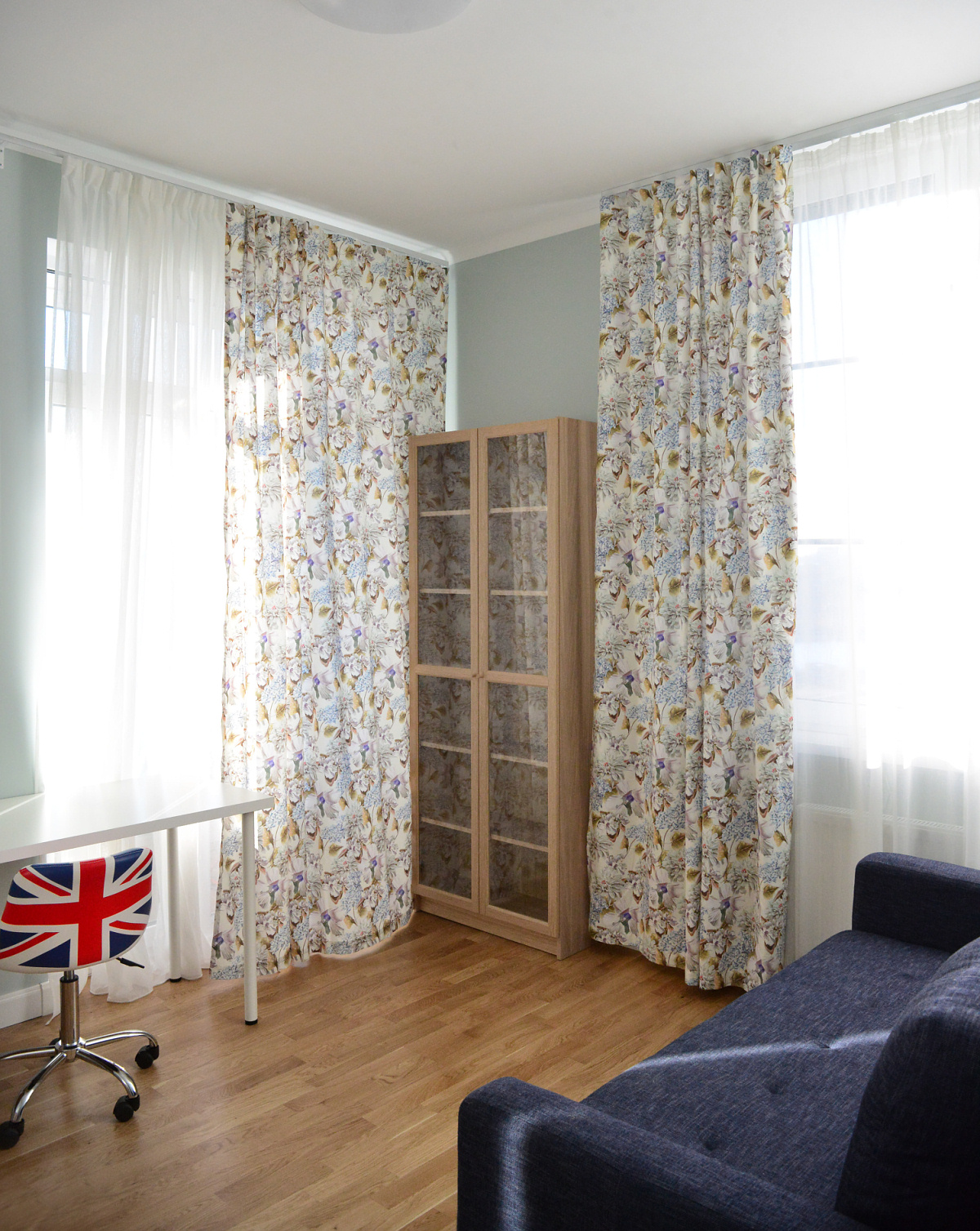 Гостевая комната предназначена для взрослой дочери Ирины, которая часто у нее останавливается. Она оборудована раскладным диваном, книжным и платяным шкафами, рабочим столом.