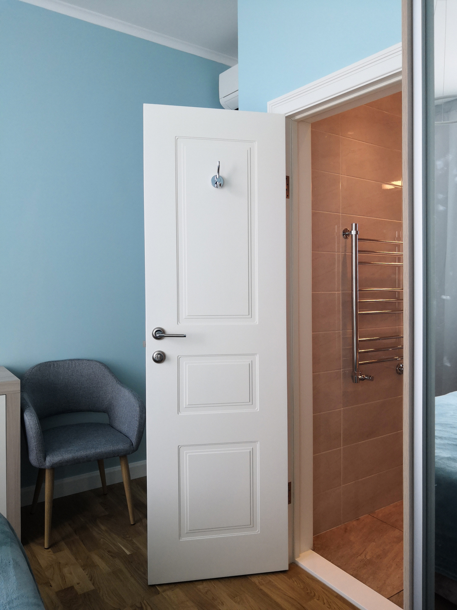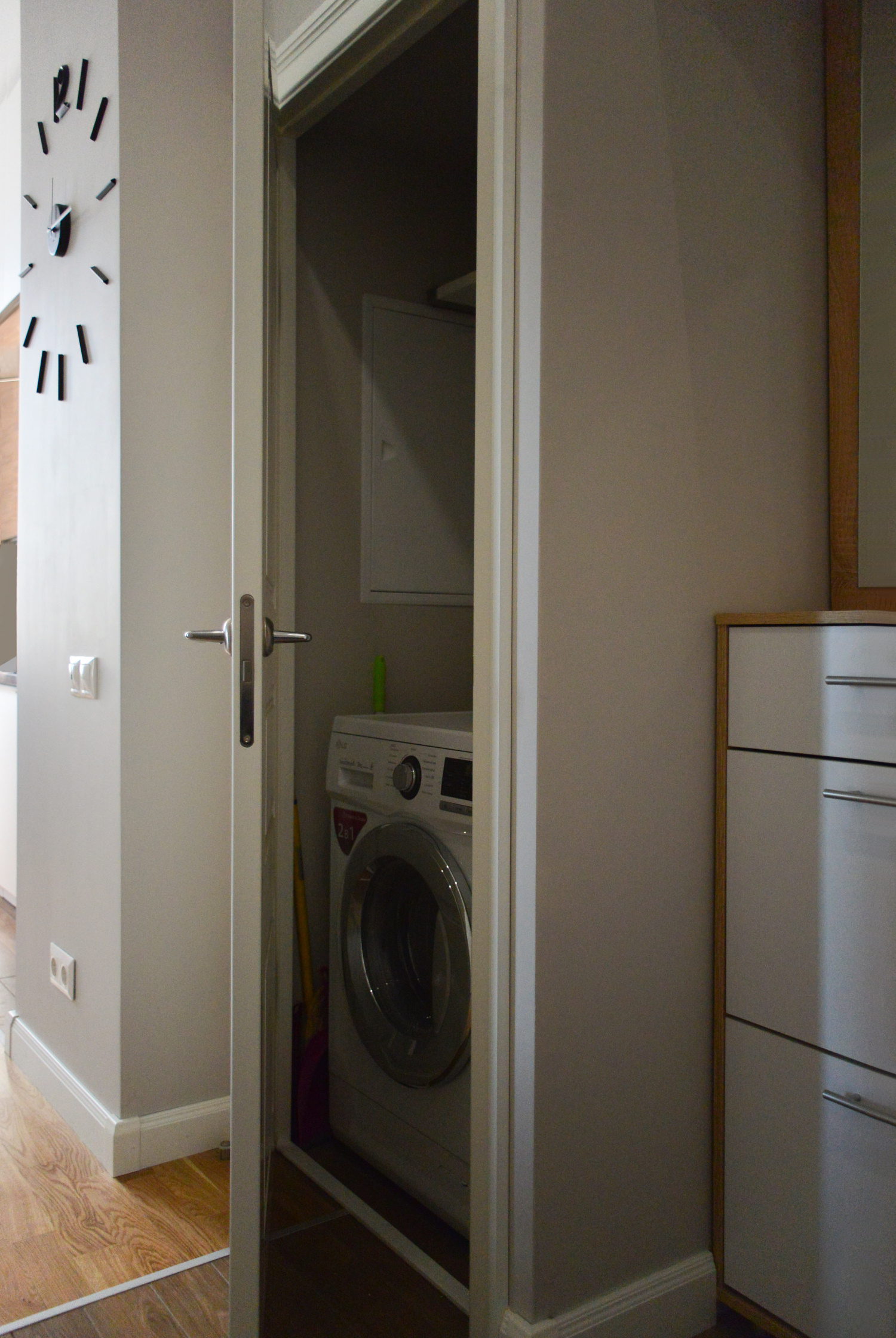 В зоне прихожей расположилась мини-постирочная с наглухо закрывающейся дверью. Стиральная машина не вместилась в санузел, и Ирина позаботилась о том, чтобы минимизировать шум от ее работы.