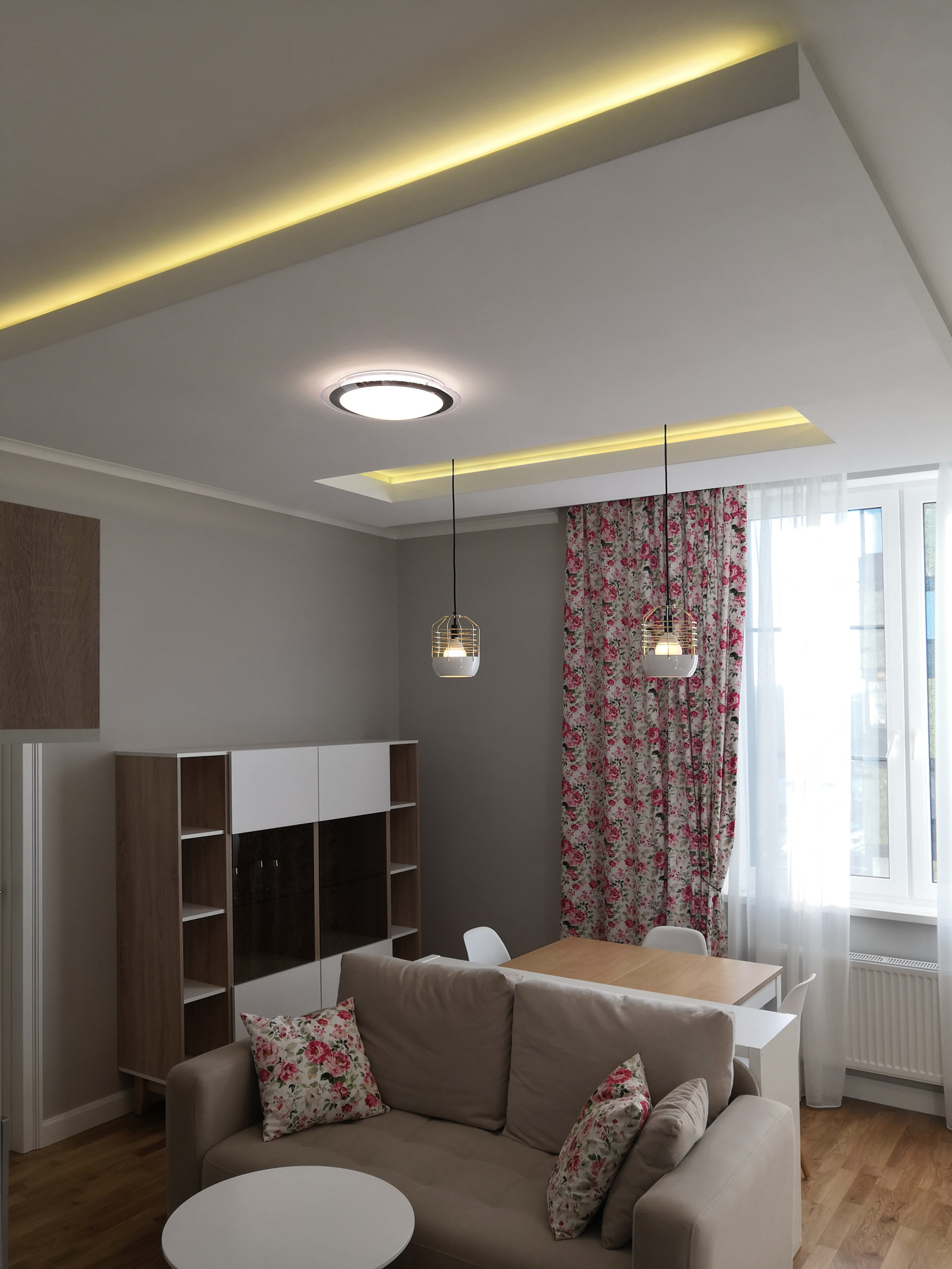 В кухне-гостиной планировалось сделать многоуровневый потолок с подсветкой. Но окна, доходящие до самого верха, не позволяли организовать его привычным образом: заниженный уровень потолка заблокировал бы створки окна.