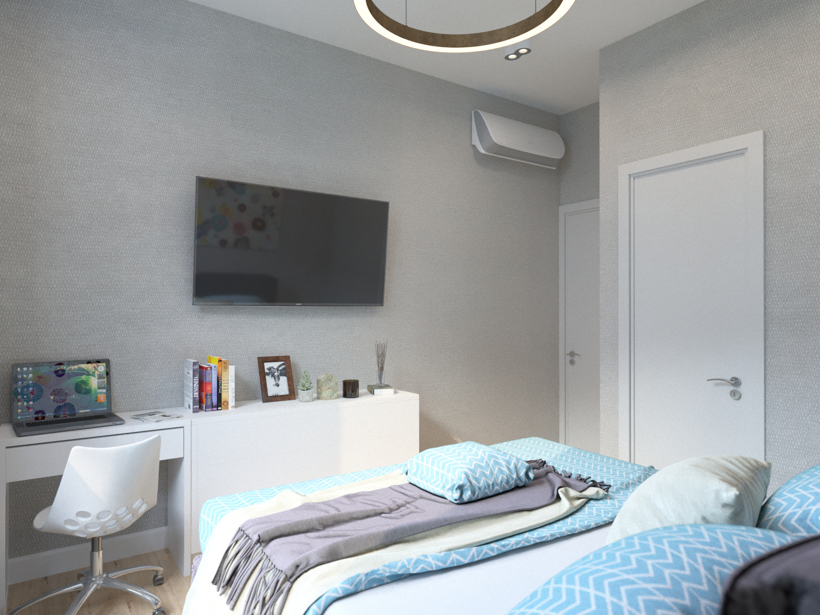 В ней немного мебели, но есть все необходимое: шкаф с зеркалом, тумба и личная ванная комната.