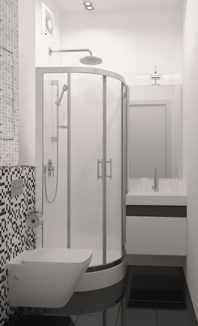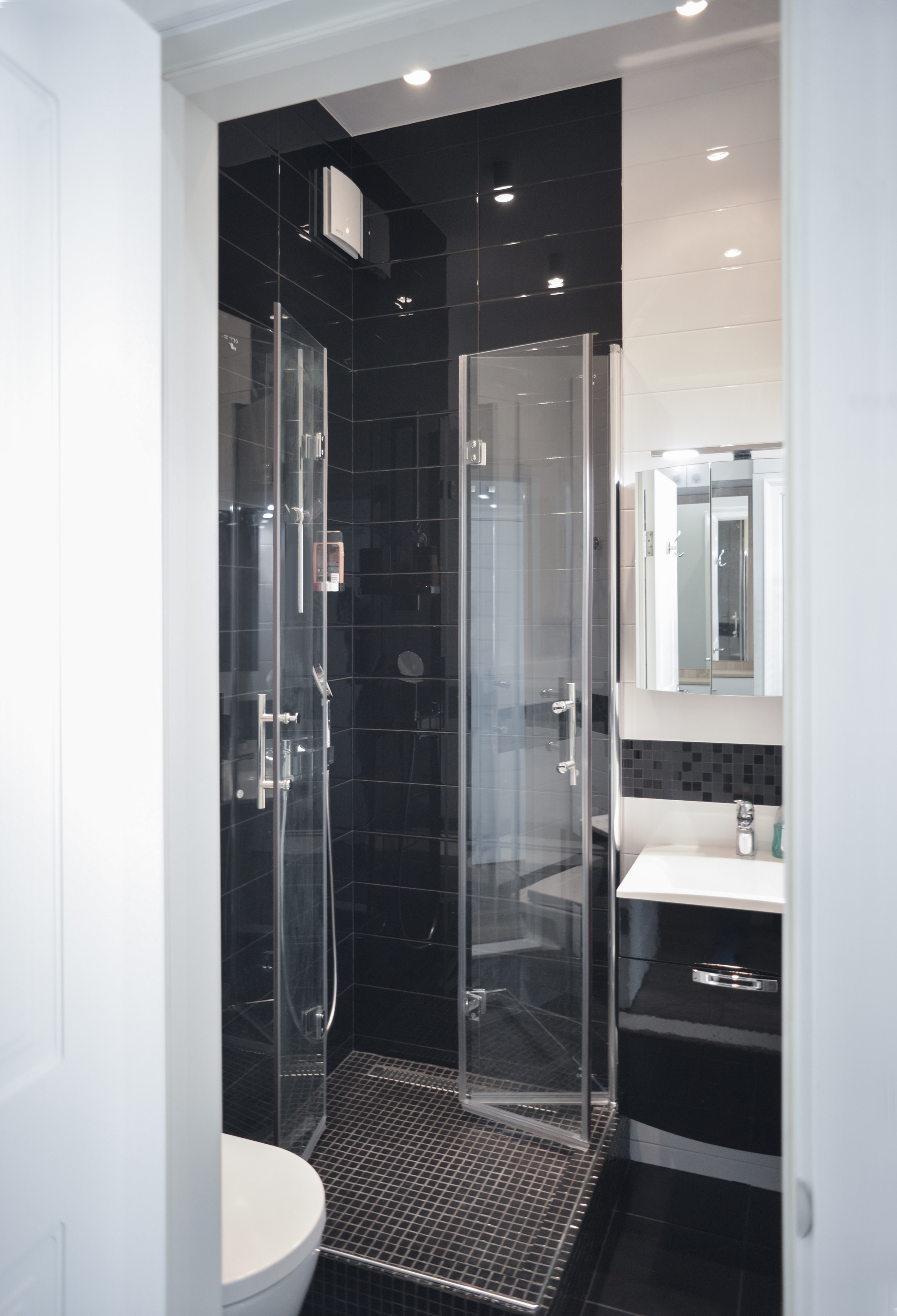 Гостевой санузел оформлен в черно-белой гамме. Дизайнер предлагала менее маркий светлый пол, но Ирина отдала предпочтение пусть и требовательной к уборке, но более эффектной черной глянцевой плитке.