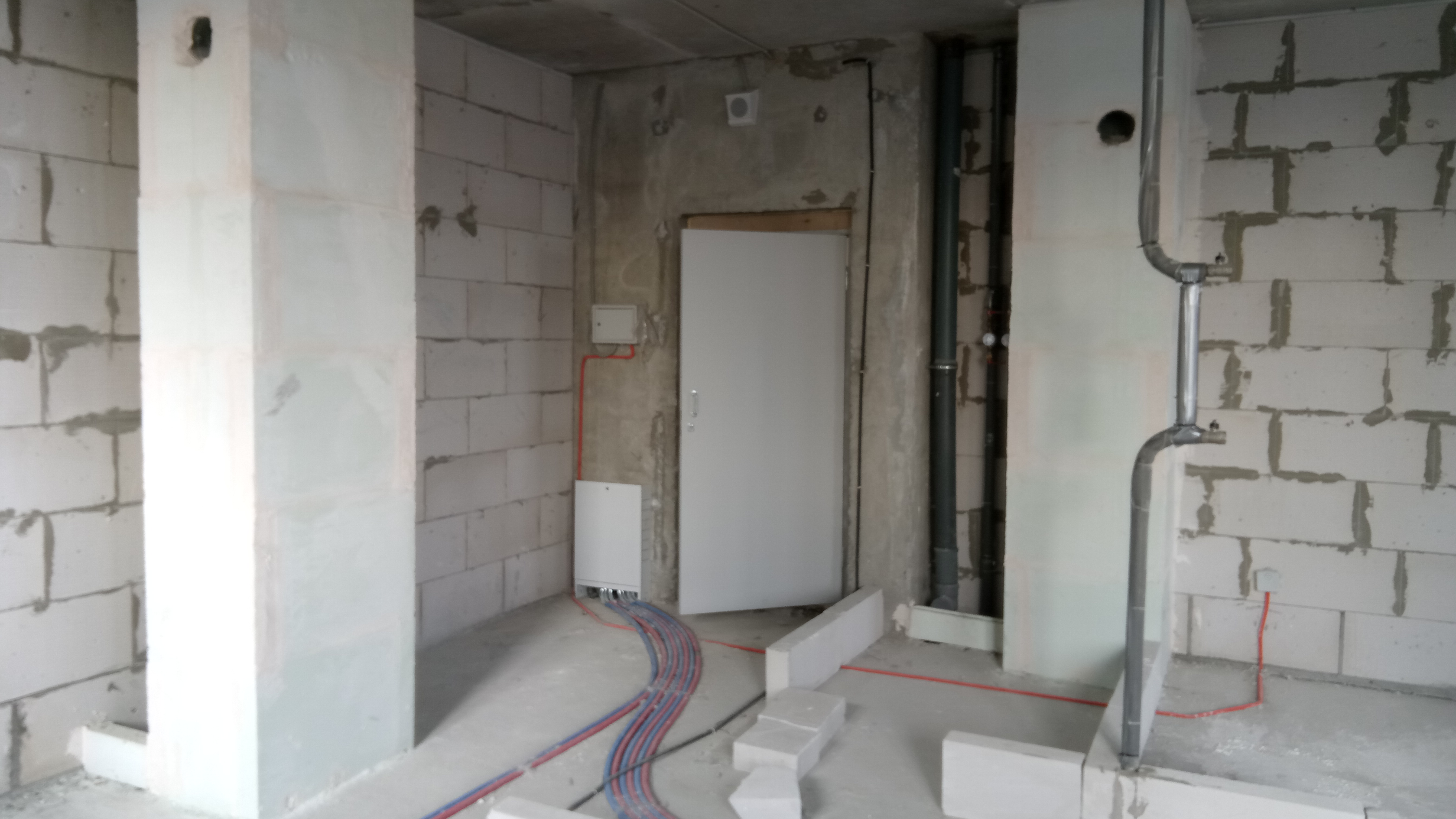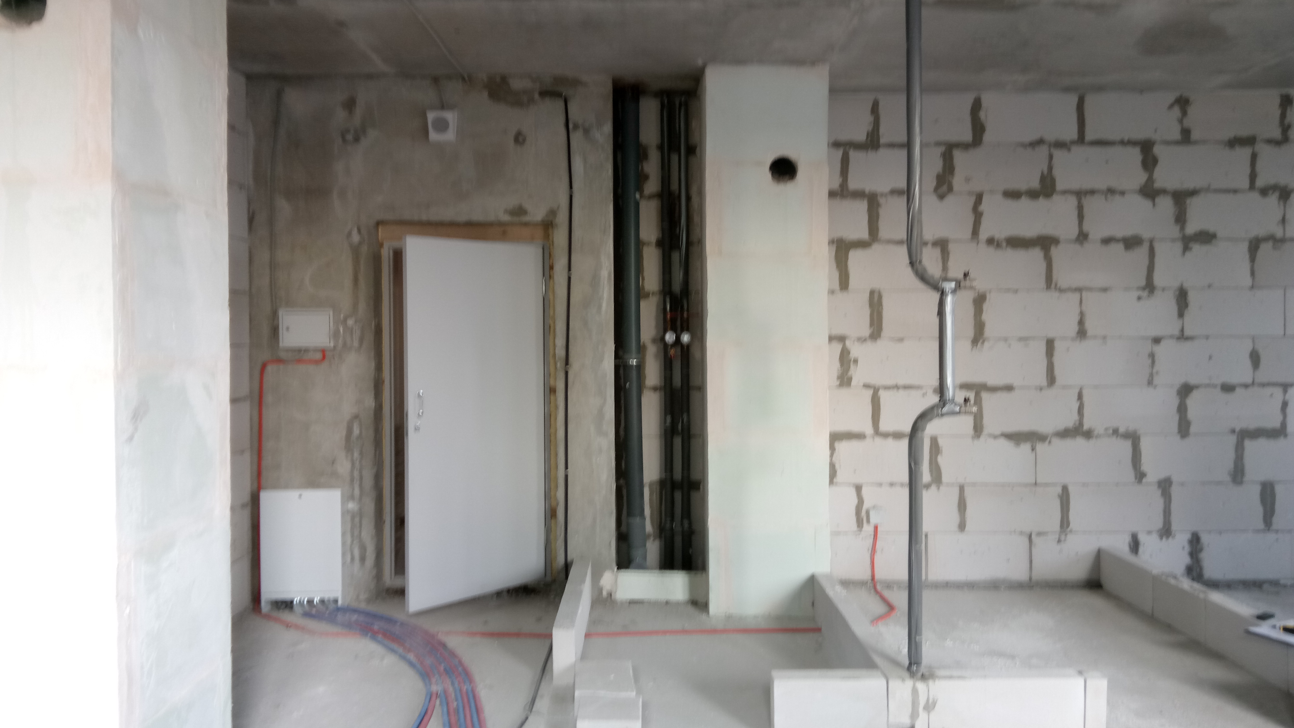 Одной из сложностей при работе над планировкой квартиры стал стояк полотенцесушителя, расположенный по центру помещения. Стены удалось спроектировать таким образом, что трубы полностью скрылись из виду.