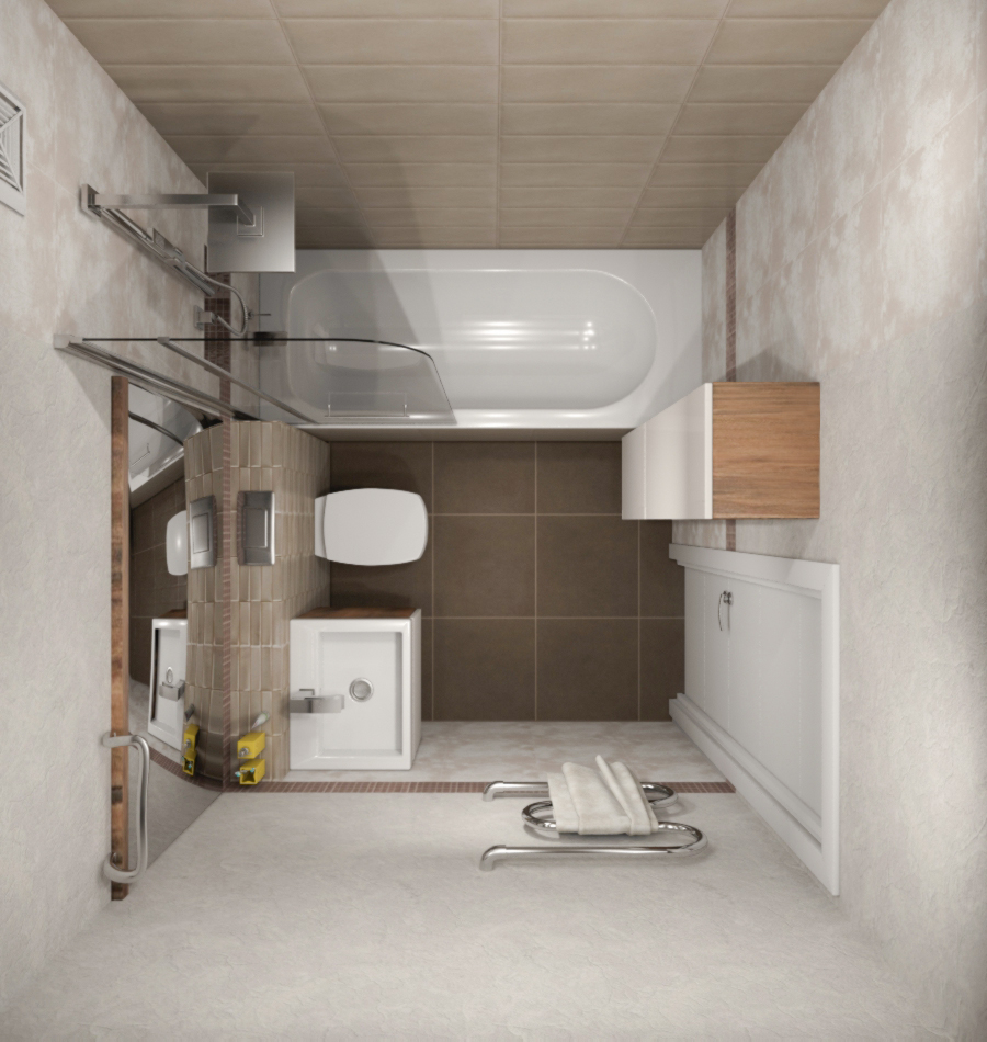 Сложная форма помещения позволила устроить над смесителем ванной полку-нишу для банных принадлежностей.